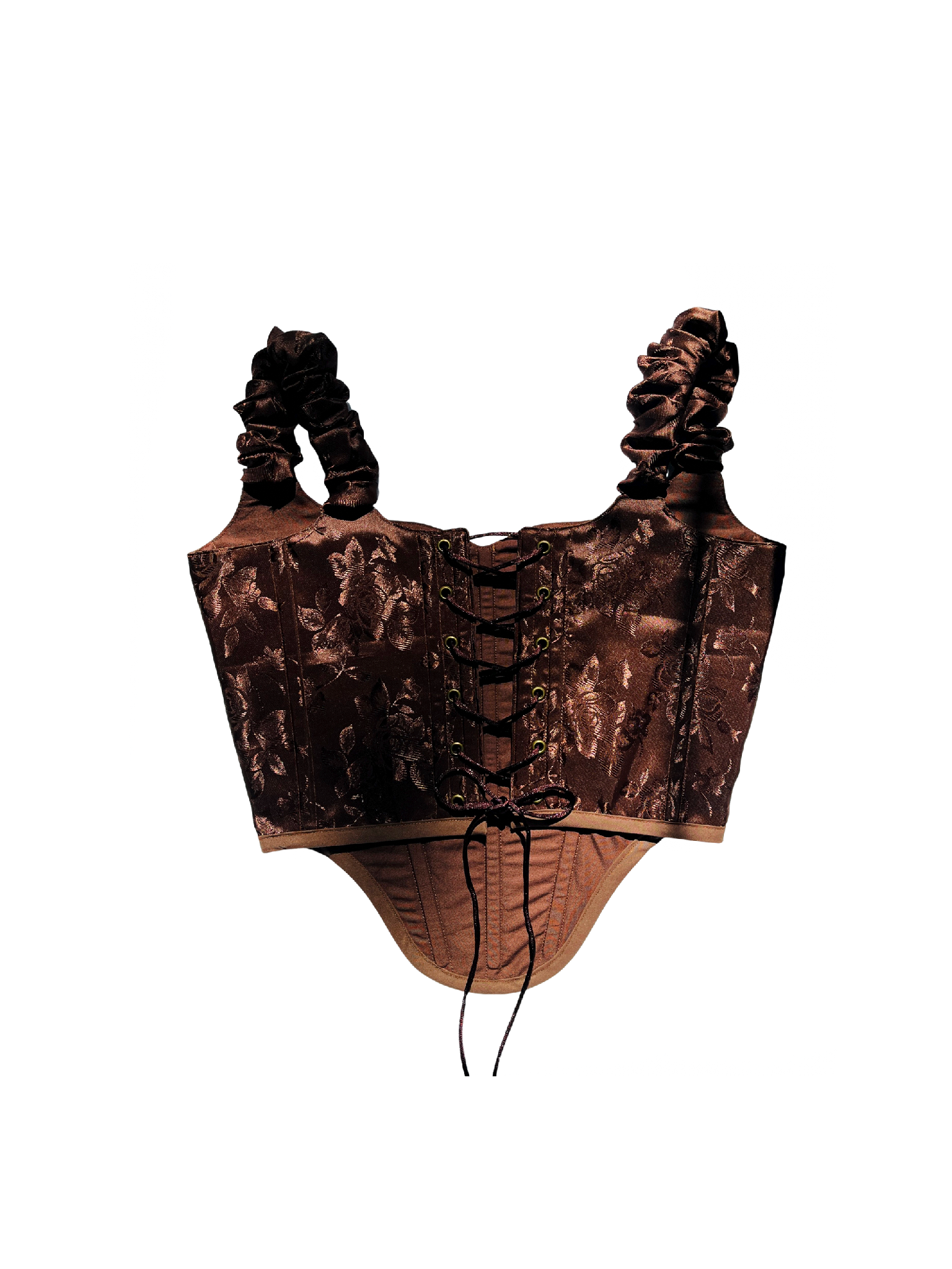 Cherub Angels Tapestry Corset Bustier with soft waist shaping boning, lace-up back closure and scrunchy stretch velvet shoulder straps. Pairs perfectly with a high-waist midi skirt or wide leg pant ✨