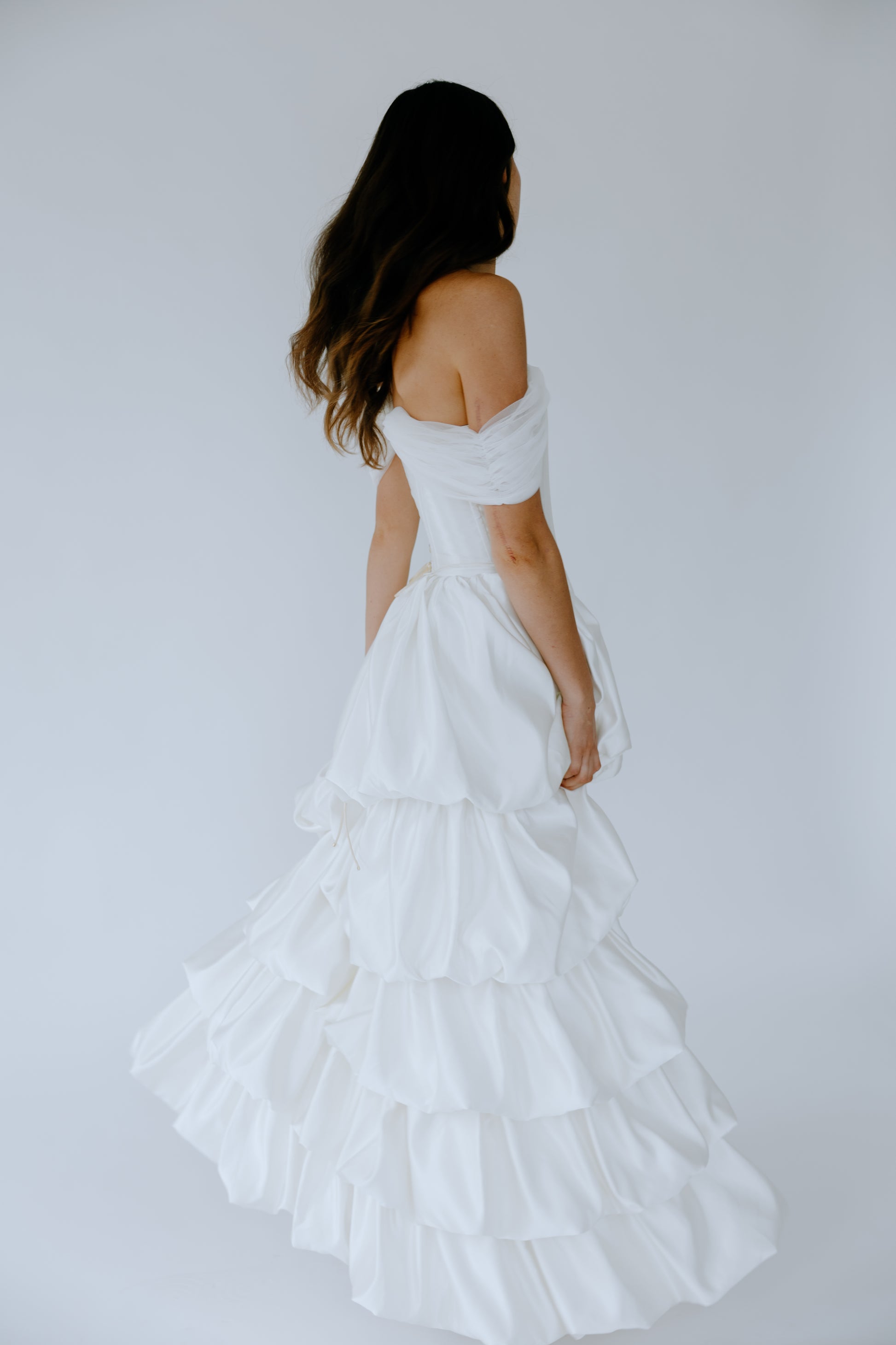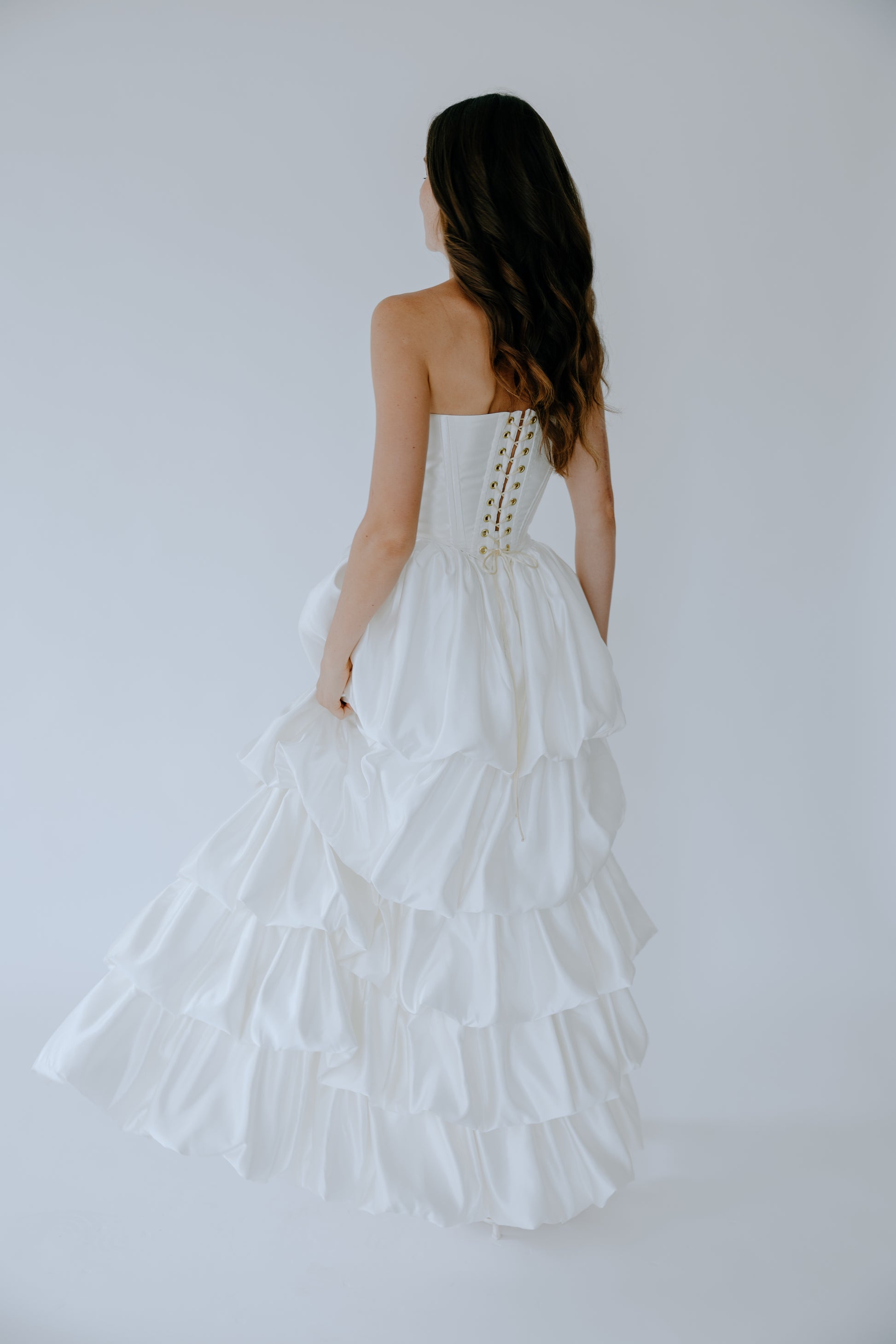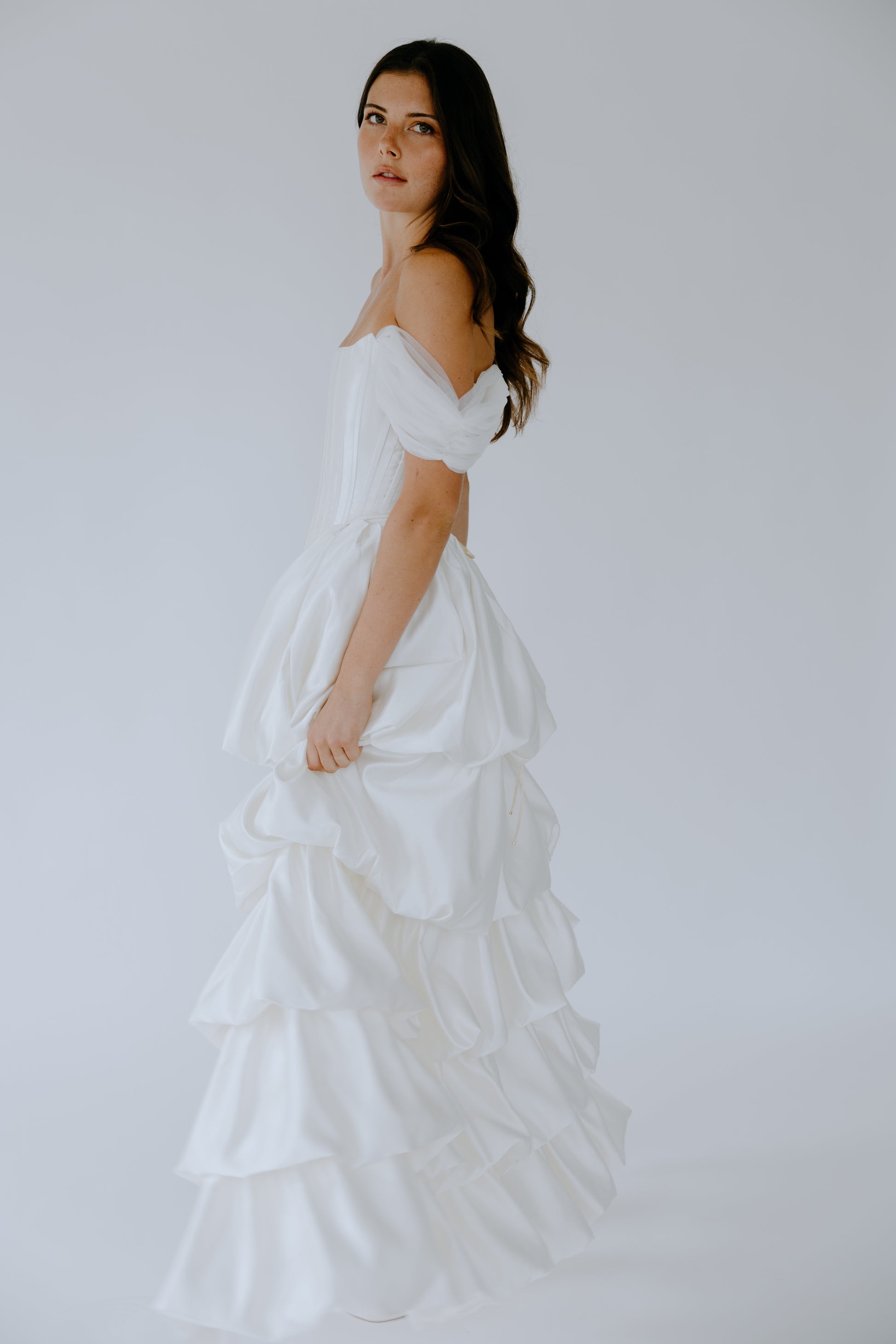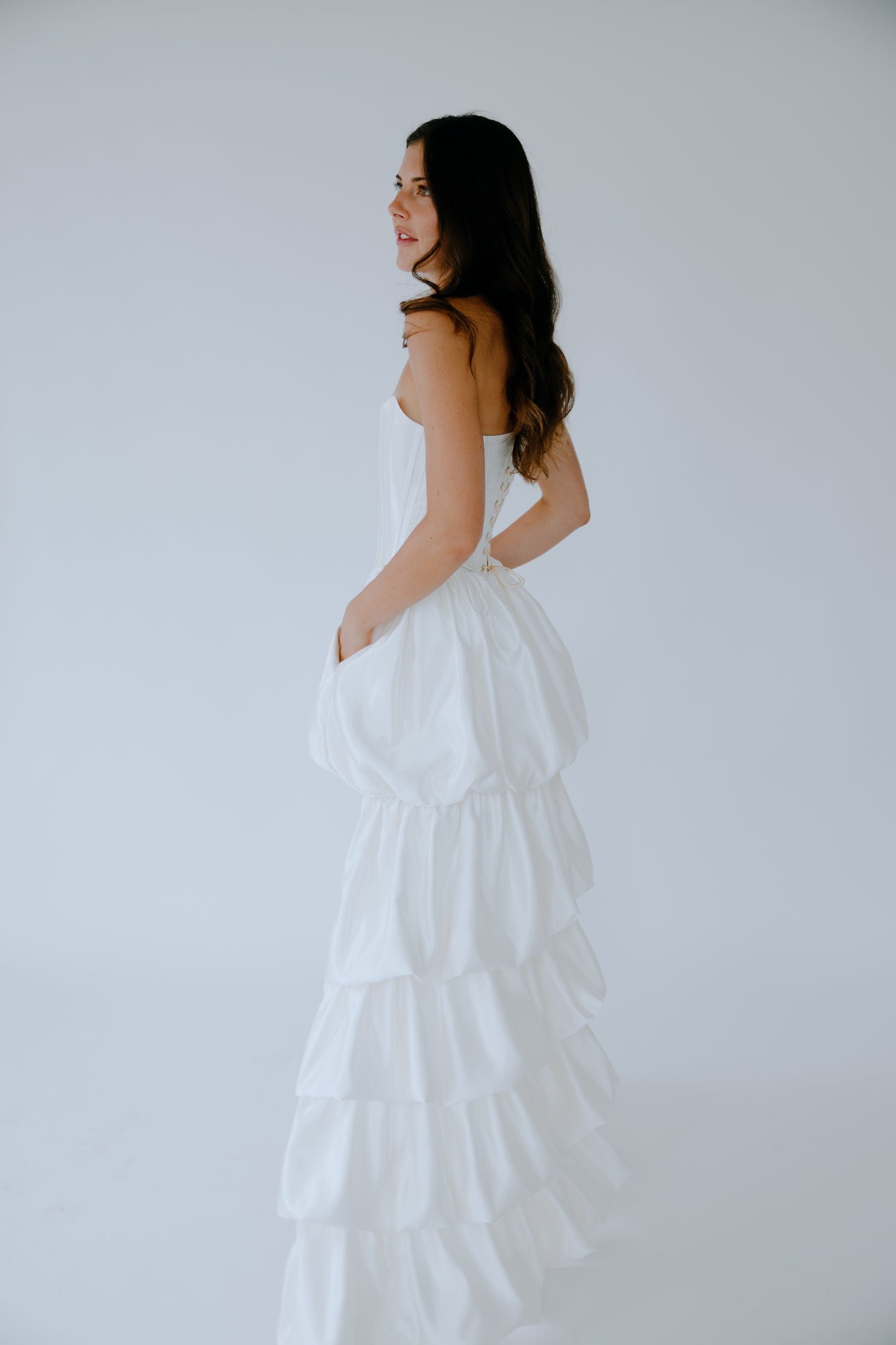 Crafted from 100% premium Italian silk, The Cascade seamlessly merges the traditional corset once worn by British ladies of court in the late 19th century with a modern, layered high-low skirt. Removable off-the-shoulder tulle straps offer versatile styling, allowing for two distinct looks in one design. Discreet pockets add a touch of modern practicality. The curated balance between the structured bodice and the fluid drape of the skirt creates a look that is both timeless and strikingly modern.