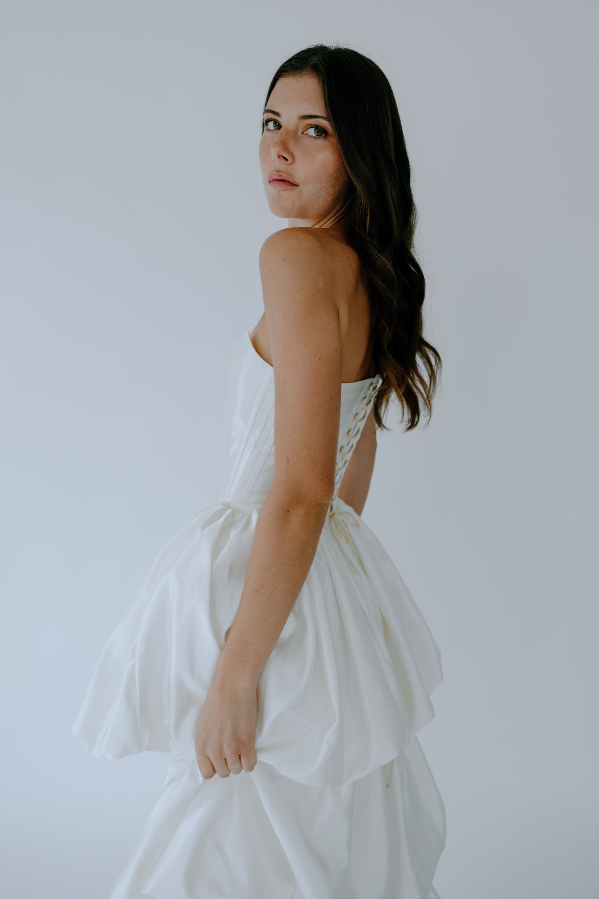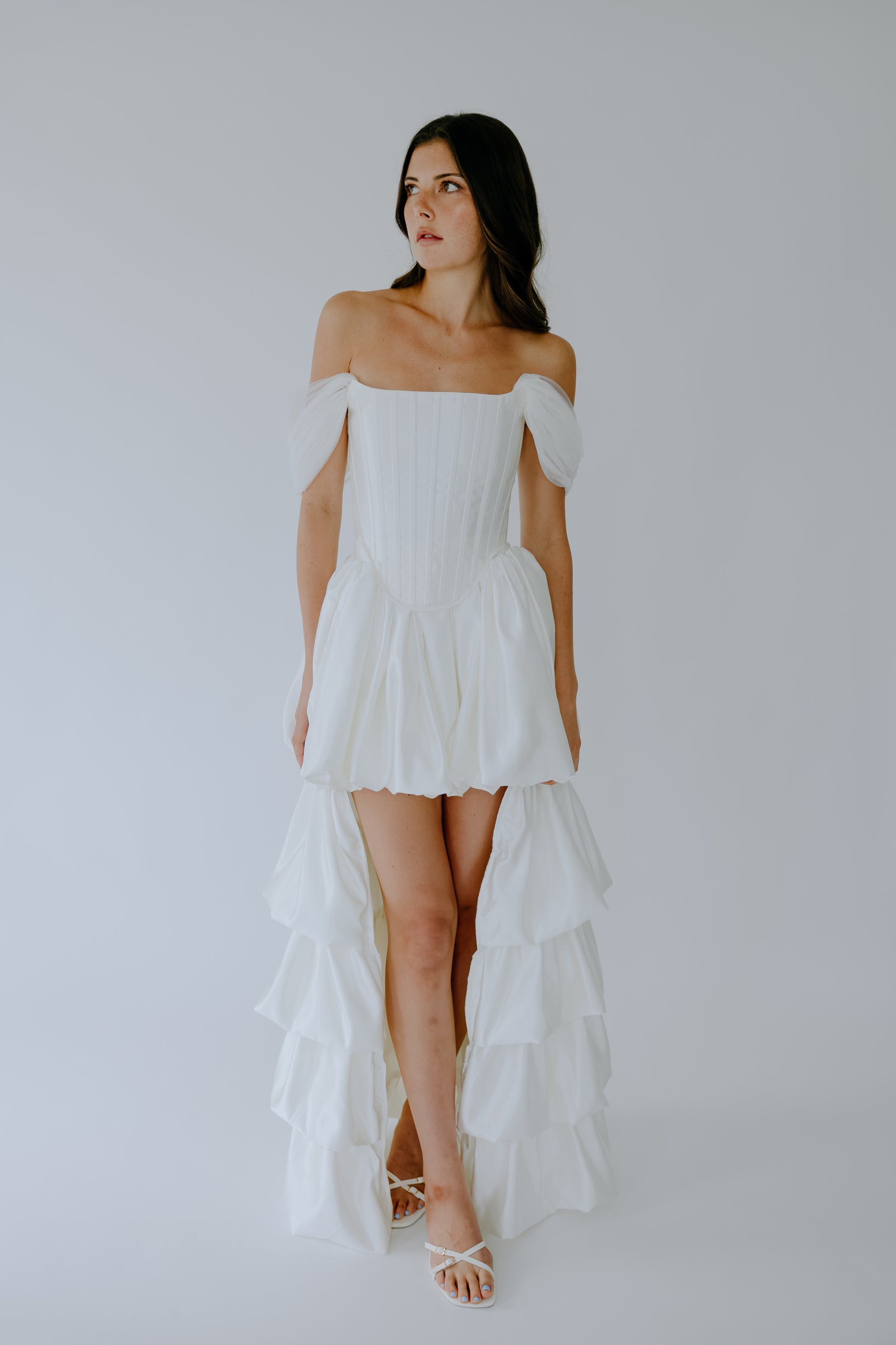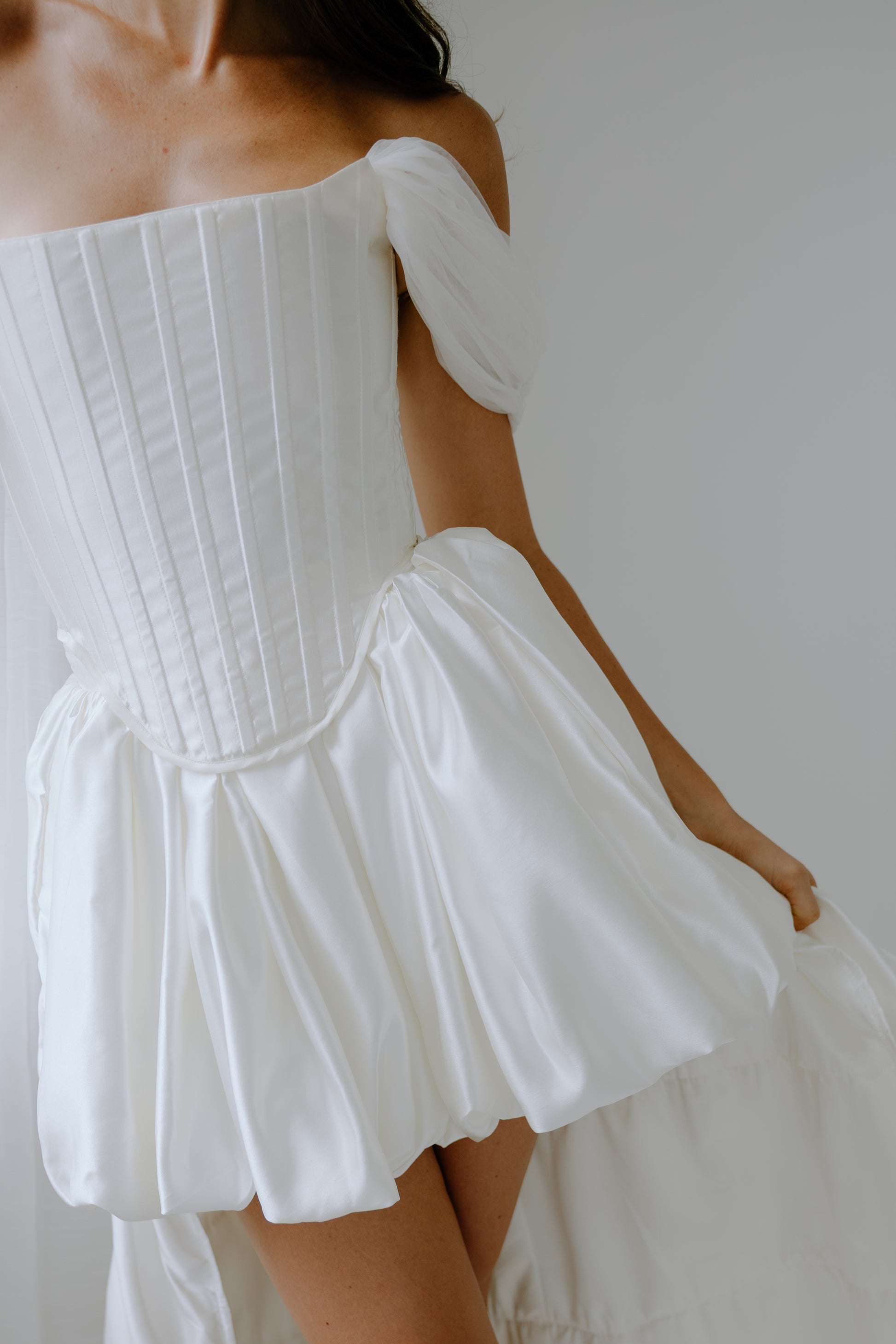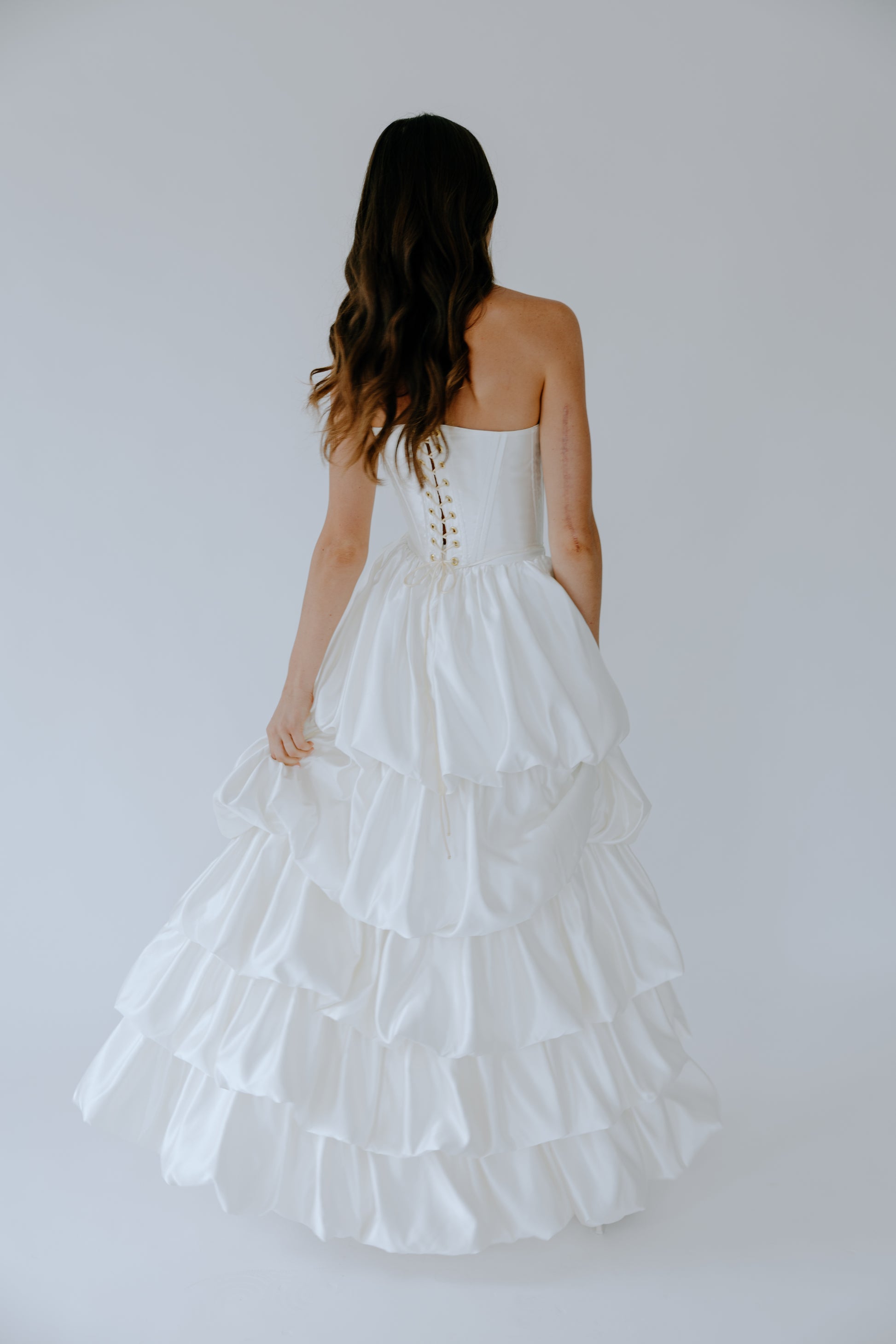 Crafted from 100% premium Italian silk, The Cascade seamlessly merges the traditional corset once worn by British ladies of court in the late 19th century with a modern, layered high-low skirt. Removable off-the-shoulder tulle straps offer versatile styling, allowing for two distinct looks in one design. Discreet pockets add a touch of modern practicality. The curated balance between the structured bodice and the fluid drape of the skirt creates a look that is both timeless and strikingly modern.
