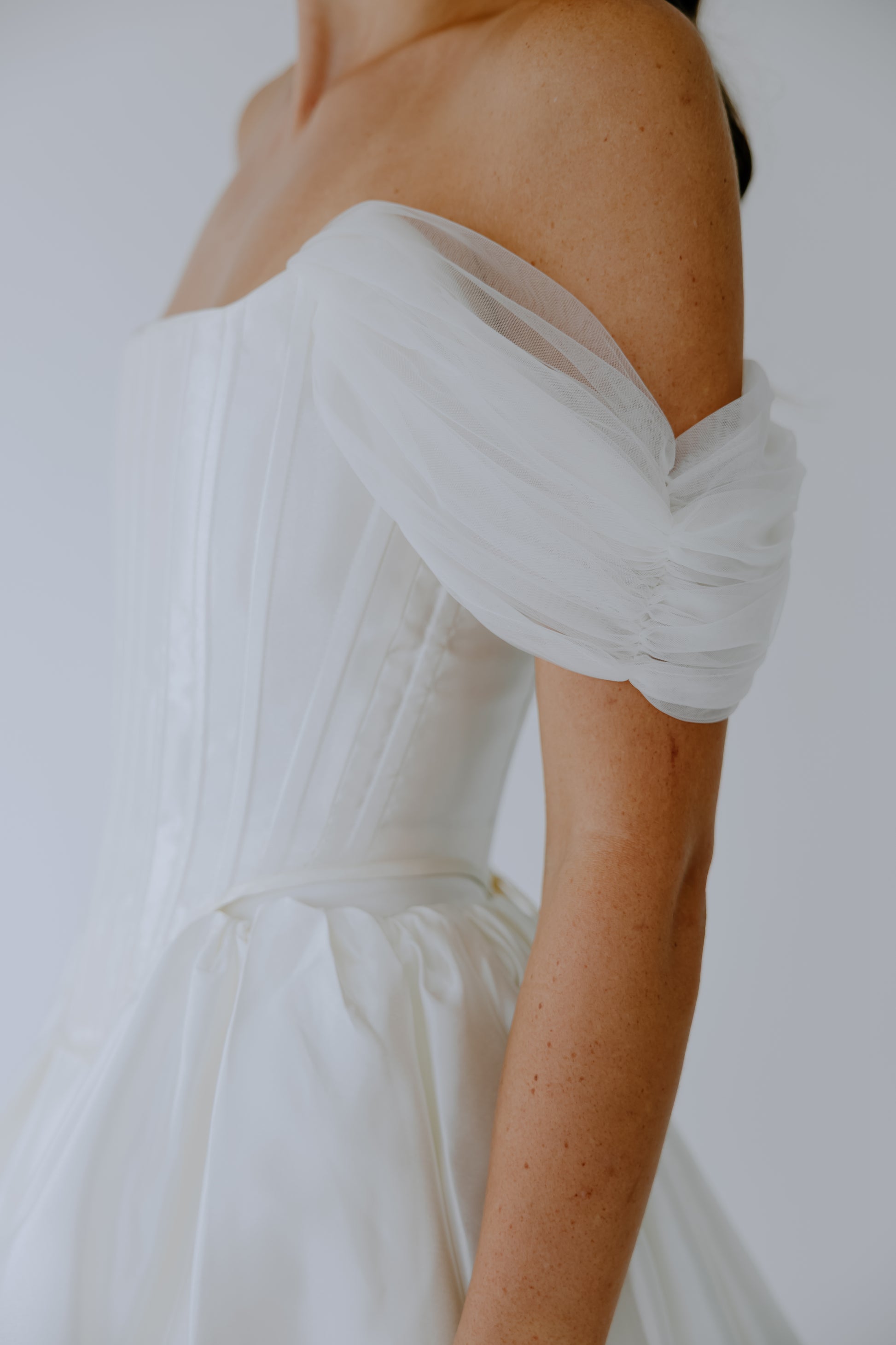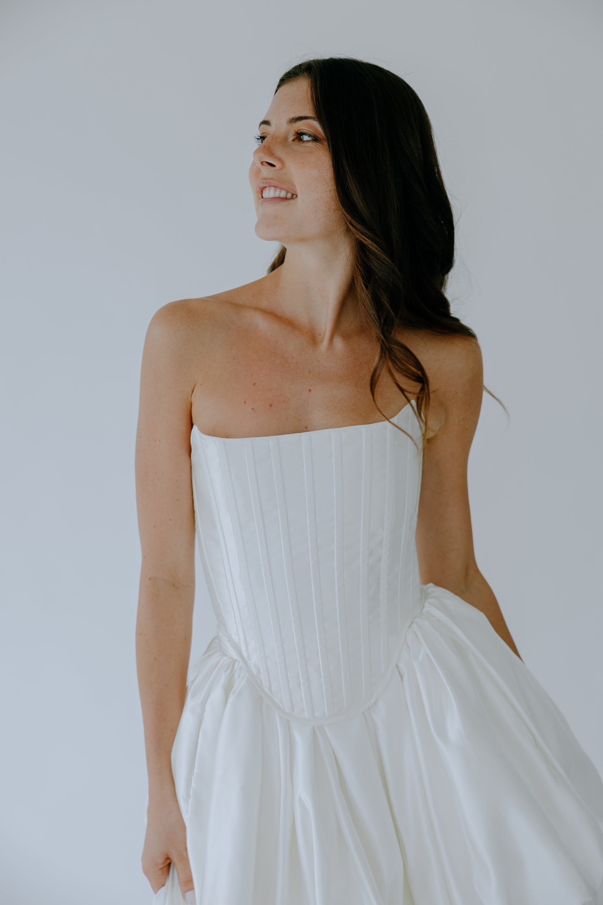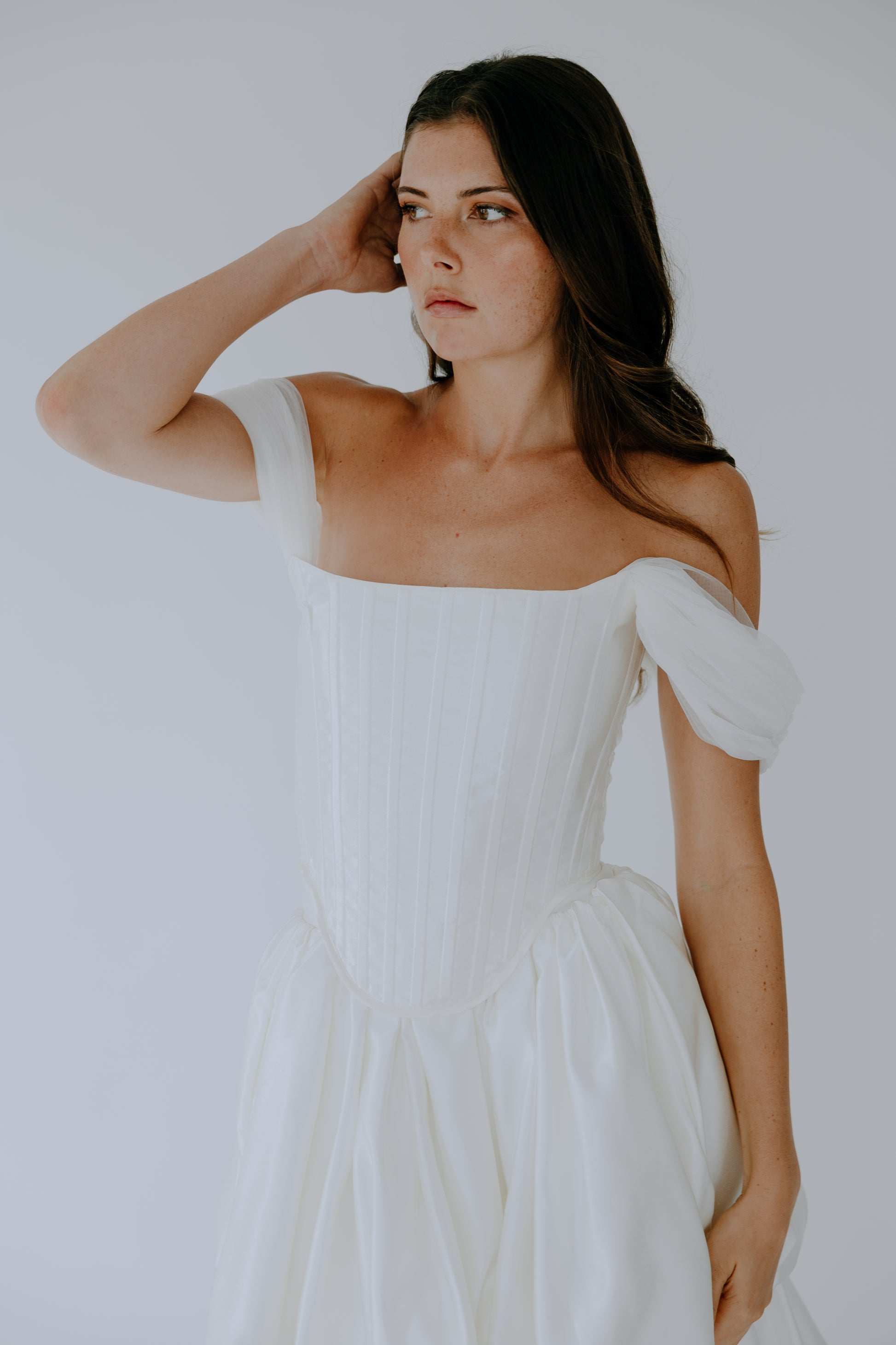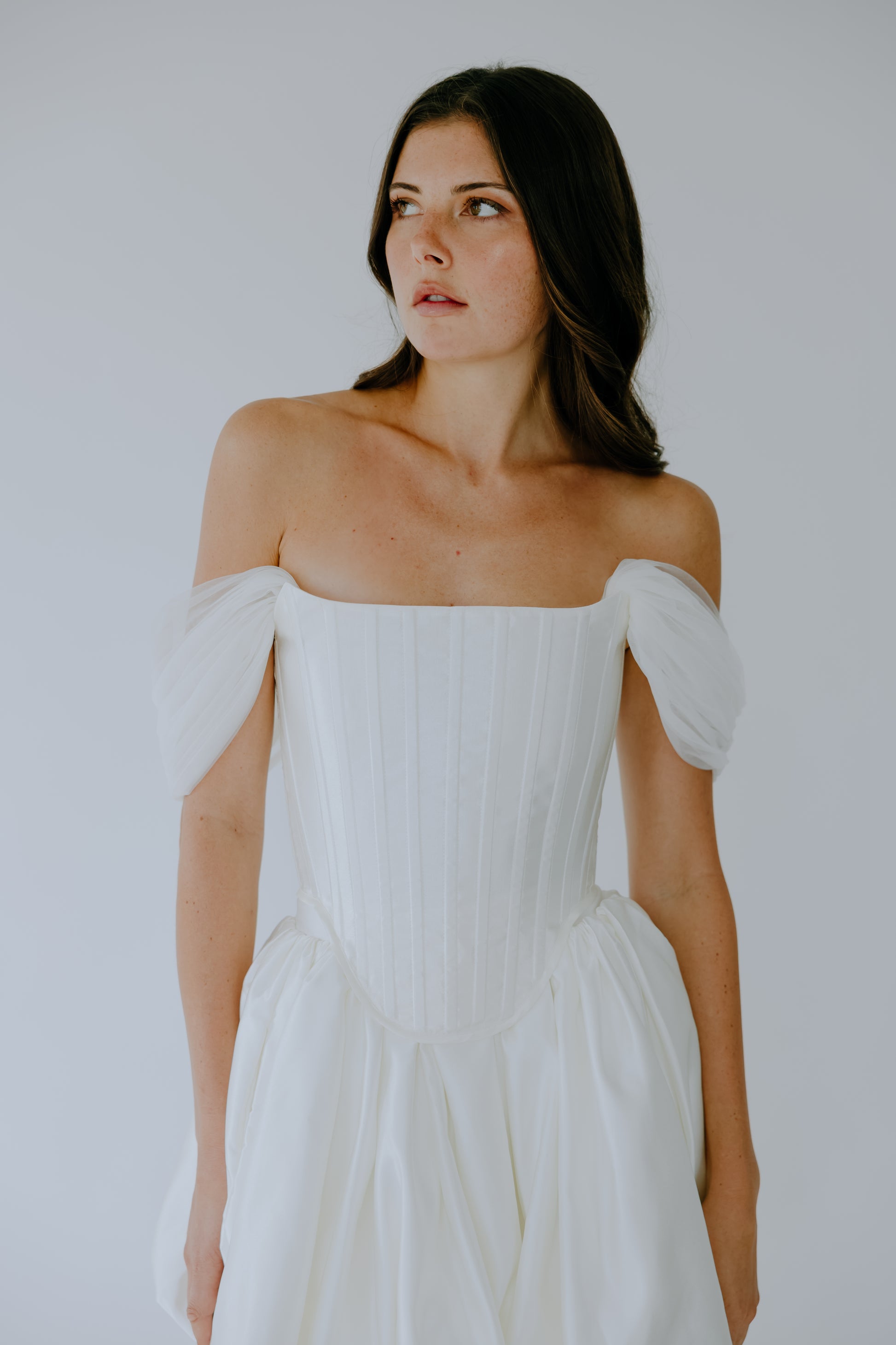 Crafted from 100% premium Italian silk, The Cascade seamlessly merges the traditional corset once worn by British ladies of court in the late 19th century with a modern, layered high-low skirt. Removable off-the-shoulder tulle straps offer versatile styling, allowing for two distinct looks in one design. Discreet pockets add a touch of modern practicality. The curated balance between the structured bodice and the fluid drape of the skirt creates a look that is both timeless and strikingly modern.